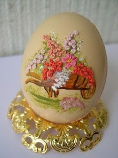 Элизабет Кляйн из Франции уже в течение десяти лет создает на яйцах картины цветущих крестьянских садов, протягивая через проделанные в скорлупе яйца дырочки яркие шелковые ленты. Трехмерный эффект и благородный блеск шелка дают возможность знатокам охарактеризовать ее уникальное искусство как «Поэзия на яйце».